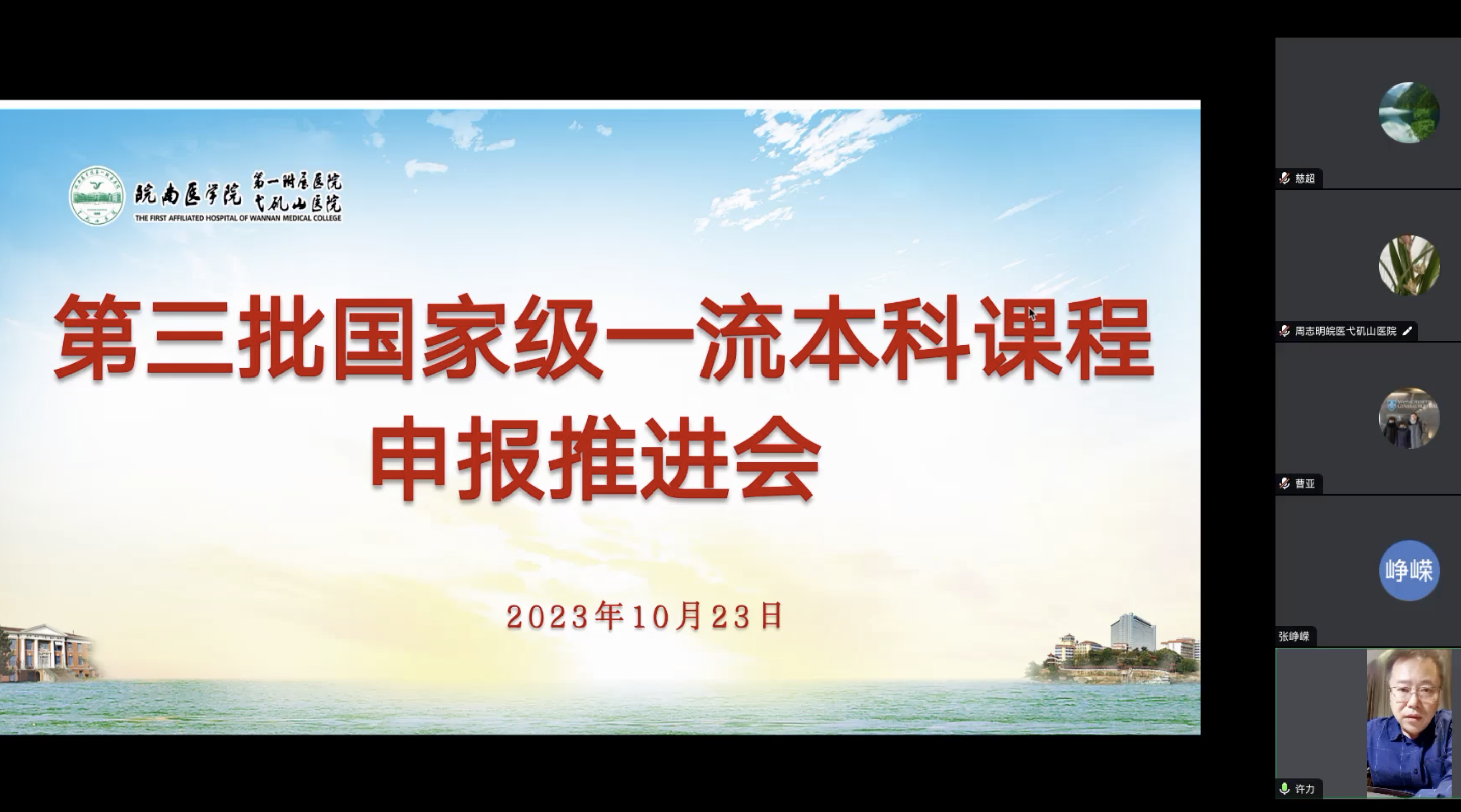 为进一步推动第三批国家级一流本科课程申报工作,切实提高课程建设质量,10月23日晚,太阳成官网组织召开线上会议部署推进国家级一流本科课程申报工作,相关课程负责人及团队成员,太阳成官网、第一附属医院教育处相关人员参会。会议由太阳成官网经理、第一附属医院正处级组织员许力主持。