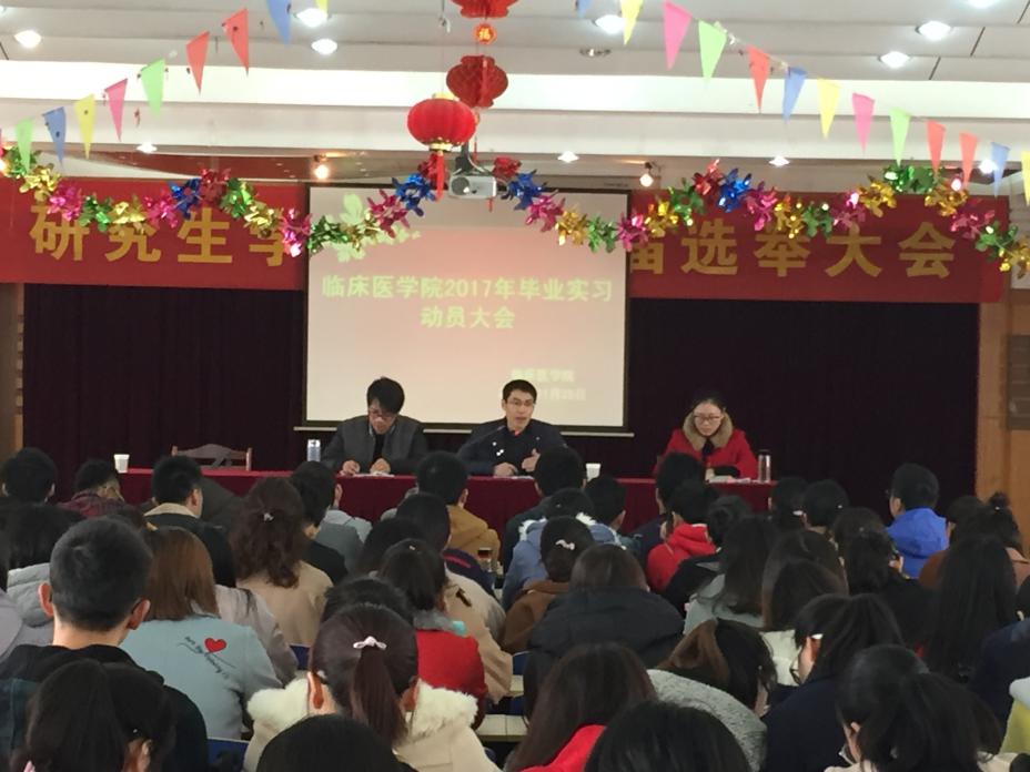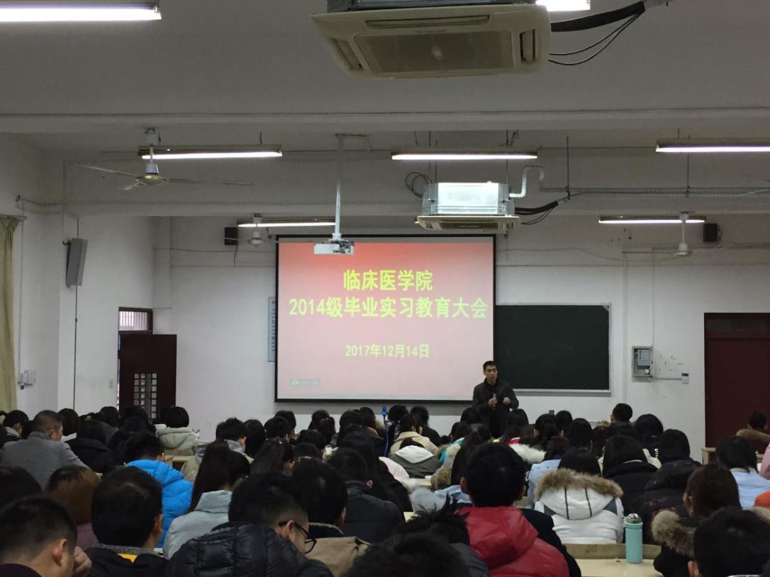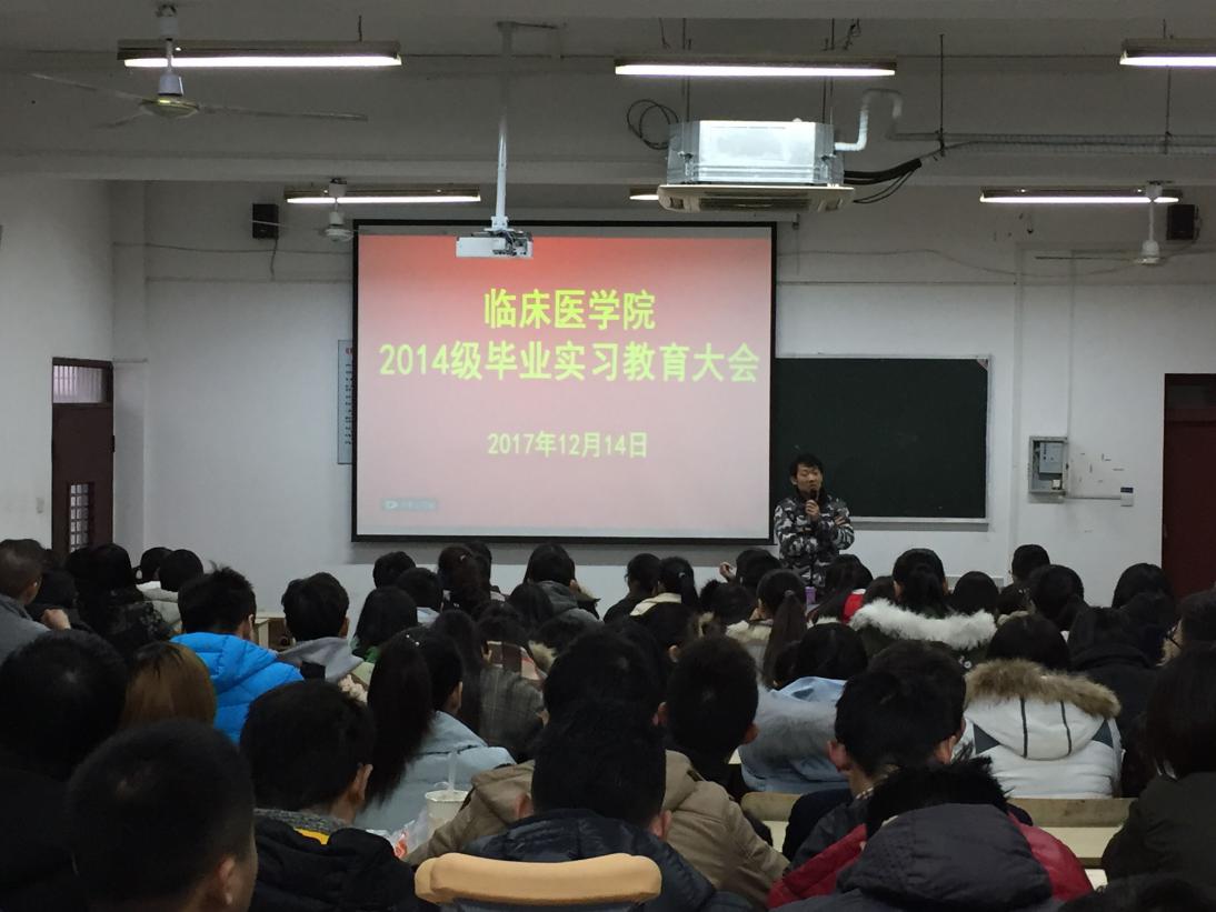 11月 26日-12月4日,学院精心组织,扎实推进,依次完成了员工实习志愿填报、志愿收集、志愿分配等各项工作。为了帮助员工更好地明确实习目标、确定奋斗方向、助力员工成长,学院于12月17日在赭麓校区召开毕业实习教育大会。会上,副经理李曙首先结合自己的实习和从教经历,向同学们强调了实习过程中要做好三个转变、注意四个安全、处理好若干关系,要求同学们要明确定位、提高段位、提升品位。随后,王平就毕业实习大纲、实习鉴定、科室轮转、实习月报表等事项重申实习具体任务和劳动纪律。最后,2017年全国临床技能大赛获奖选手叶世菲结合自己的参赛心路历程以及考研经历,与同学们进行了经验交流。