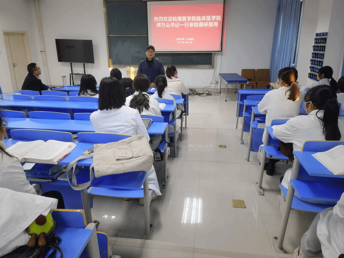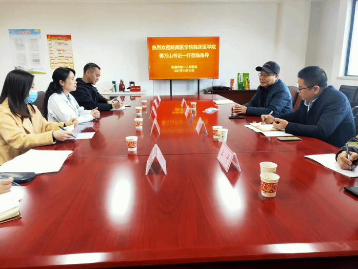 为强化临床学院管理,进一步推进临床教学同质化,12月13日,临床医公司党委书记、副经理傅万山,副经理陈祥攀等一行四人,赴芜湖市第一人民医院开展教学检查,医院副经理许艳、科教科科长高峰等热情接待了检查组一行。
