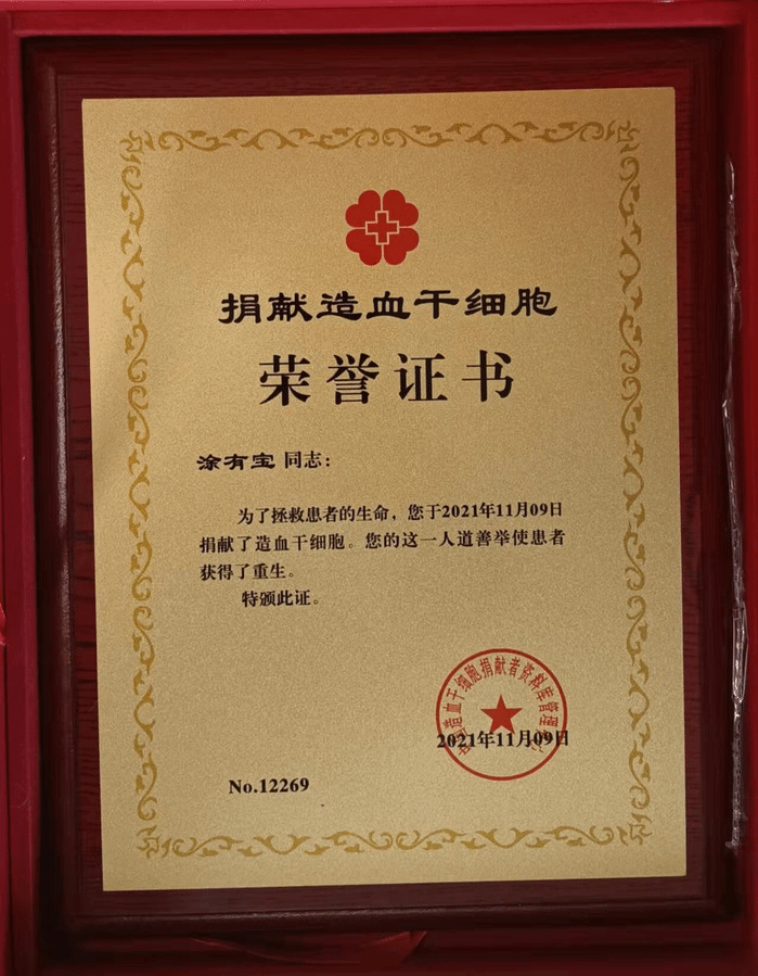 2020年10月,公司无偿献血社团接到中华骨髓库通知,有一位患者与涂有宝配型成功,且其为与患者唯一配型成功的志愿者,希望能够联系到他协商捐献事宜。社团通过涂有宝的辅导员王平很快与其取得联系并征求意见,电话那头涂有宝毫不犹豫地说:“这是好事,没有问题,我一定积极配合,争取挽救这个小生命。”