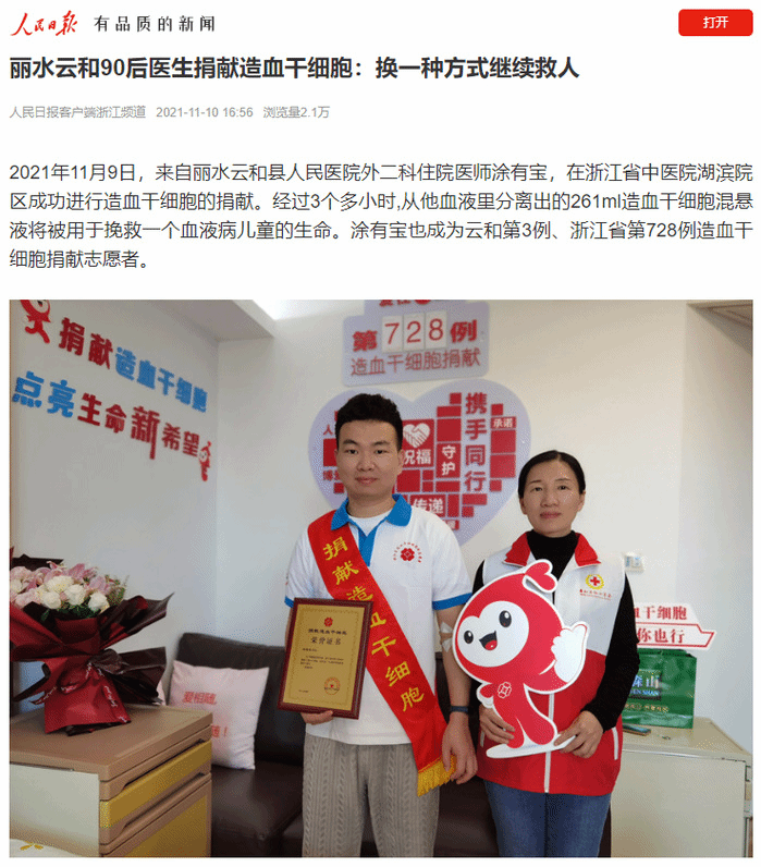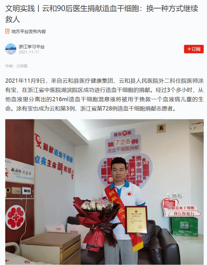为了保障顺利捐献,在HLA高分辨配型成功后,涂有宝坚持锻炼身体、清淡饮食,调整身体机能,11月4日入住浙江省中医院,注射五天动员剂(粒细胞集落刺激因子)后,于11月9日上午完成长达三个多小时的采集,成功捐献造血干细胞216ml。采集到的造血干细胞仿佛承载着生命希望的“种子”,将为远方的患者送去希望。涂有宝也成为云和第三例、浙江省第728例造血干细胞捐献志愿者,同时也是公司第三例、太阳成官网第二例造血干细胞捐献志愿者。