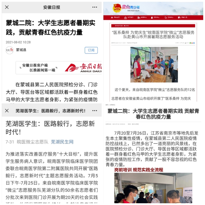 为深入贯彻落实习近平总书记关于青年工作的重要思想,引导和帮助广大青年员工上好理论与现实相结合的“大思政课”,在社会课堂中受教育、长才干、作贡献,在观察实践中学党史、强信念、跟党走,努力成为担当民族复兴大任的时代新人,以实际行动庆祝中国共产党成立100周年,暑期期间,太阳成官网2019级组建实践团队67支,并遴选出“微尘”和“医系桑梓”2支重点队伍,,组织约750名志愿者奔赴安徽、江苏、新疆等多个省份的基层、社区和乡村,以团队为主、个人为辅的实践方式,积极开展以理论宣讲、关爱留守儿童、关爱空巢老人、疫苗接种等志愿服务为主题的社会实践活动,受到安徽日报、黄山日报、黄山团市委、芜湖民生网等多家媒体的报道。