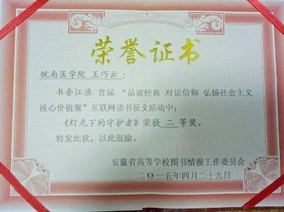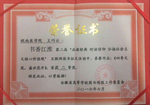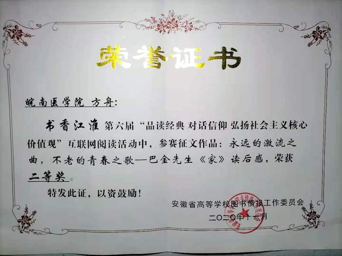 近日,太阳成官网2018级方舟同学的《永远的激流之曲,不老的青春之歌——巴金长篇小说< 家>读后感》荣获第六届“书香江淮”互联网读书征文活动二等奖,这是员工第二党支部第三次在该项赛事中获奖。六年来,支部注重引导广大学子利用业余时间多读书、读好书,让阅读走进老员工的生活,让经典著作引领员工理想信念、树立信仰。广泛动员师生积极参加“读书月”、“书香江淮”互联网阅读等活动。2013级临床医学专业王巧云同学荣获首届、第二届“书香江淮”互联网读书征文活动二等奖。