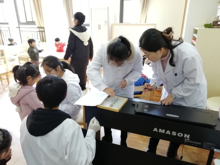 第二阶段为样本采集工作,分组在6个教室同时开展。采集开始前,志愿者们通过蛲虫标本展示,生动描述蛲虫生活史,宣传蛲虫病预防知识,以引导幼儿配合采样检查工作。志愿者们在专业老师的带领和指导下,采用较为高效的透明胶纸法进行样本采集,并通过活动前期的认真准备,按幼儿名单为玻片进行编号和分组。他们整齐佩戴口罩手套,每两人一组,负责检查15-16名幼儿,有序对幼儿园170余名幼儿进行样本采集工作。采集结束后志愿者们细心为幼儿穿戴整齐,并整理收拾好教室卫生。检测的170余份待测样本带回学校专业实验室进行检测筛查,后续将及时向幼儿园反馈检查结果,以方便后续预防与治疗。