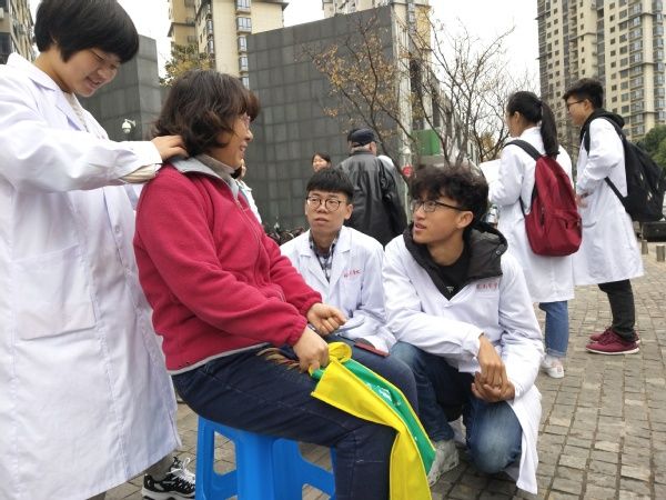 17日上午,41名志愿者来到南街社区进行健康志愿服务。志愿者们或是为老年人测量血压,提醒高血压病人冬季用药注意事项;或是向来往居民分发健康知识资料,普及冬季常见流行病预防措施;还有的志愿者开展按摩保健和十式手部健康操的现场教学,向社区居民传达健康理念。志愿者们各司其职,分工明确,各项活动有条不紊。健康志愿服务受到当地居民的关注,居民们纷纷为冬日里忙碌的同学们送来问候和关心,还有一位老奶奶送来热腾腾的生煎包,让同学们感动不已,小小的社区充满了温暖和温馨。