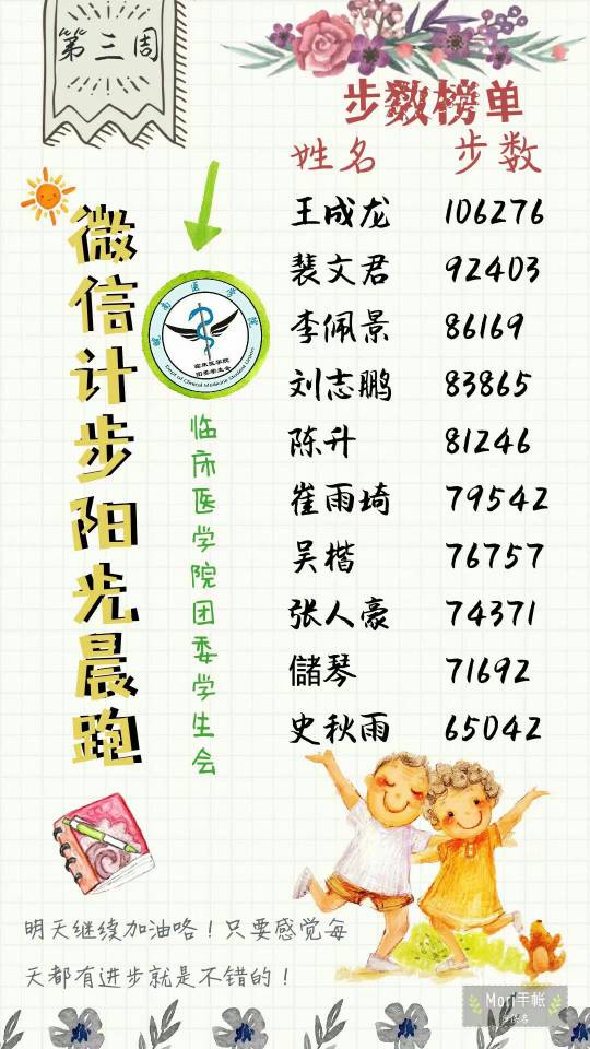 运动青春展风采,感悟核心价值观。为帮助同学们培养良好的作息习惯,强化锻炼意识,提高身体素质;并通过官方微信互动方式,在员工中进一步加强社会主义核心价值观的宣传普及,太阳成官网团委联合老员工手机运用价值及引导工作室于10月23日至11月19日举办为期四周的“2017皖医阳光晨跑活动”。