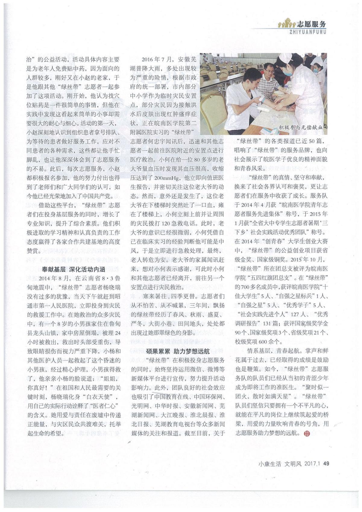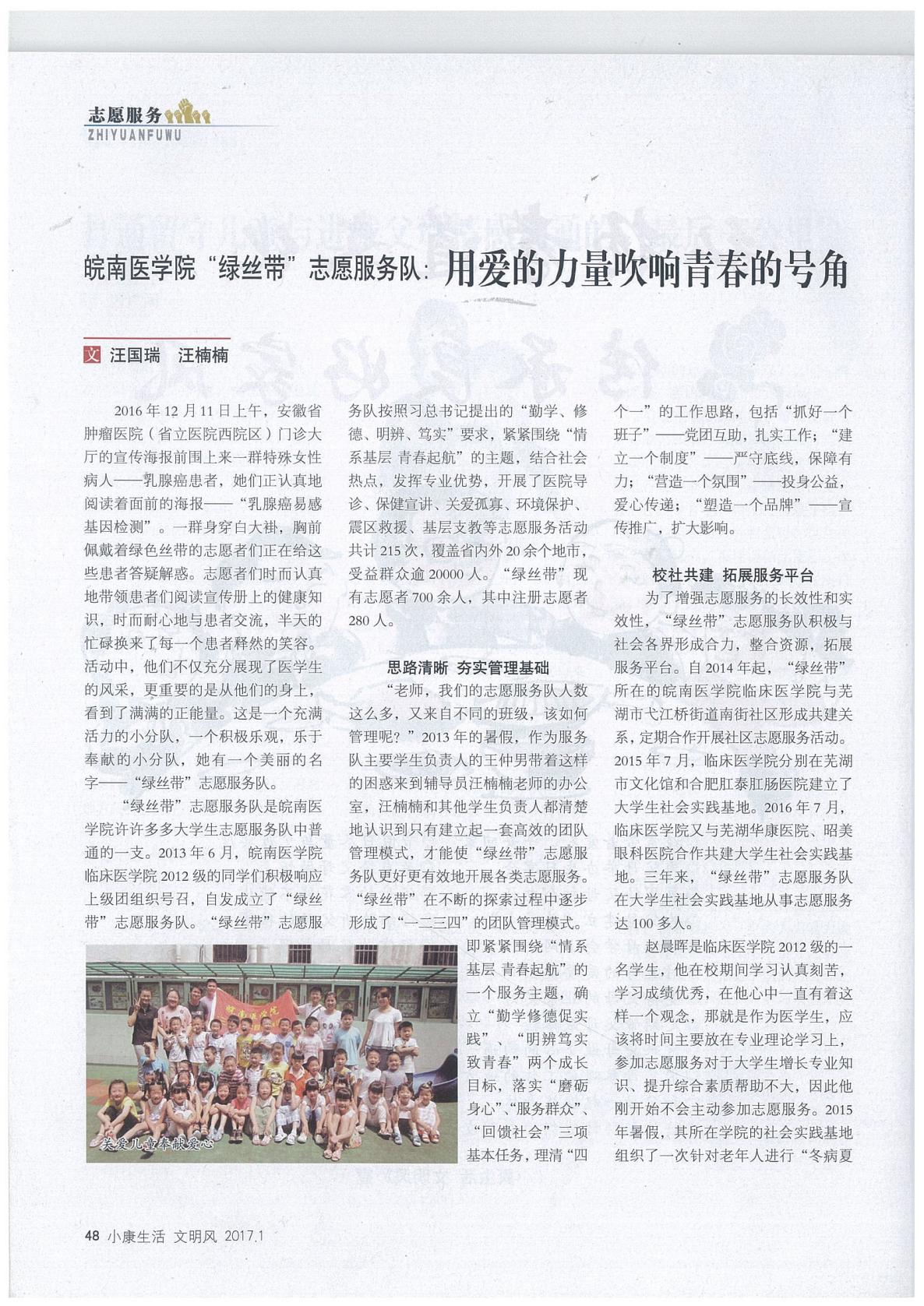 近期,安徽省文明办《文明风》杂志2017年第1期以“皖南医学院“绿丝带”志愿服务队:用爱的力量吹响青春的号角”为题,用两个整版大篇幅报道了太阳成官网“绿丝带”老员工志愿服务队先进事迹。
