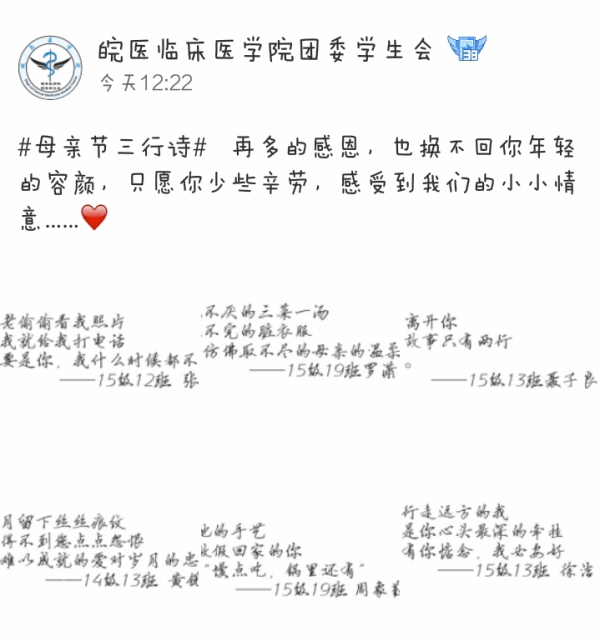 此次活动共收到来自2014级、2015级64位参赛选手的80余首三行诗,每首诗都饱含着作者对母亲的深深感谢和美好祝愿,每个字符都表达了作者对母亲诚挚的爱意。学院团委秉着公平、公正、公开的原则,在众多优秀作品中评出一等奖两名、二等奖四名、三等奖六名,并通过学院官方微信、QQ平台公布获奖名单及作品。