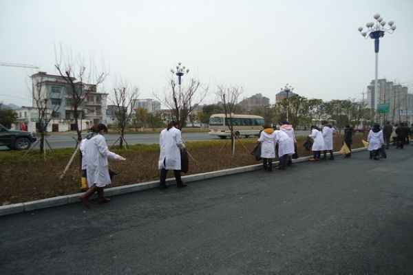 为进一步深入开展学雷锋活动,医学一系2008级实习同学积极行动起来,参与到所在医院开展的学雷锋各项活动中去,结合医院平台,积极开展“学雷锋、爱奉献”志愿服务活动。 一、爱绿护绿 美化黄山 黄山市人民医院实习队在医院工会组织下参加了黄山市文行办和总工会号召的“爱绿护绿”志愿者活动,积极投身于创先争优活动中。志愿者们毫不畏惧寒冷,在道路两旁的绿化带清除杂草和垃圾。同学们积极认真的劳动,为这不寻常的寒冷早春增添了一抹暖意,为美丽的黄山增添亮容。