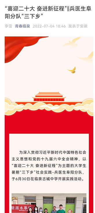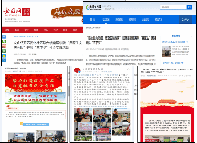 暑期“三下乡”社会实践活动是落实立德树人根本任务、创新素质教育的有效载体。2022年暑期,晨曦志愿服务队108支实践队伍共计开展服务共334次,服务对象约2.5万人次。此次社会实践活动形式多样、内容丰富,受到安徽网等多家媒体关注报道,展示了皖医青年学子良好的精神风貌。