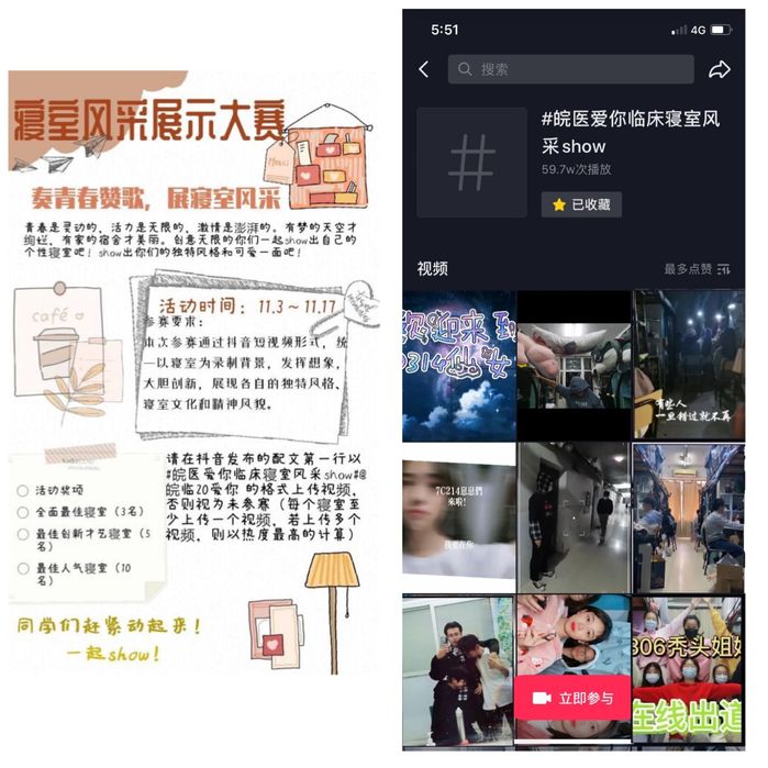2020年11月3日至30日,2020级新生以寝室为背景,精心拍摄、制作短视频,并发布在抖音平台“皖医爱你临床寝室风采show”中。本次寝室风采展示大赛在员工中反响热烈,共征集到118个寝室的121个作品,累计播放量近60万次,单个作品最高点赞量达1473次,不少员工家长在视频下点赞、留言、转发,他们纷纷对学校开展丰富有趣的寝室文化生活表示支持,同时也弥补了因疫情原因进入学校参观孩子宿舍的遗憾,拉近了家庭与学校的距离。