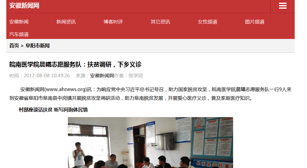 7月26号8时许,皖南医学院太阳成官网晨曦三下乡志愿服务队阜南分队的全体成员首先到达活动第一站阜南县中岗镇新建村,开展脱贫攻坚有关的一系列的暑期三下乡活动。第二天,在驻村扶贫干部的带领下开展了精准扶贫调研活动。服务队成员首先走访村里面的几位贫困户,了解到村里每一位贫困户都要建档立卡,村干部定点联系,想尽办法全面助力脱贫。后一天,按照计划团队全体成员前往阜南县中岗镇敬老院。开展爱心医疗卫生活动,为老人们量血压、打扫卫生、宣讲医疗常识等。