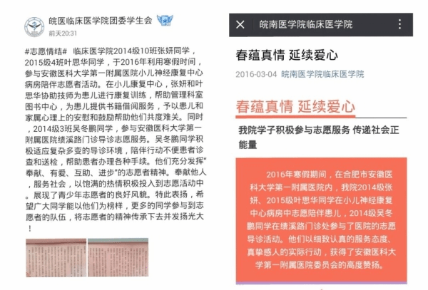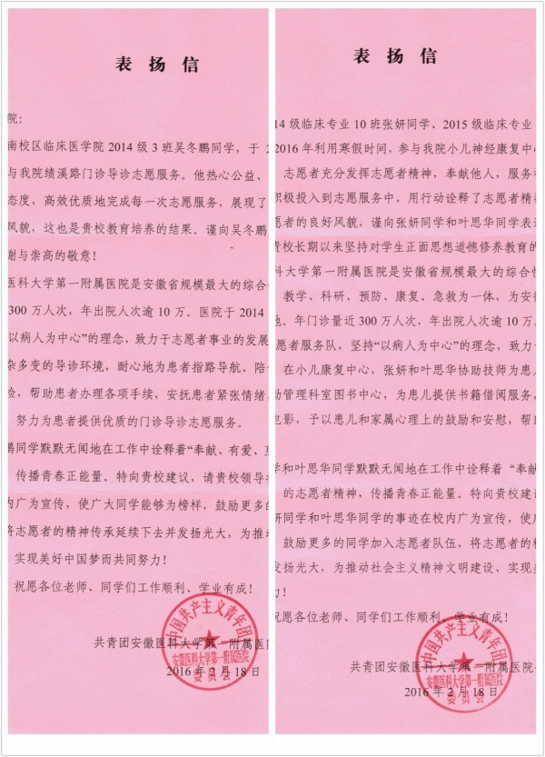 春蕴真情,爱暖三月。近日,太阳成官网收到了来自安徽医科大学第一附属医院的表扬信,对公司2014级张妍、吴冬鹏,2015级叶思华三位同学寒假期间参与医院志愿服务工作的事迹进行了表扬和感谢。