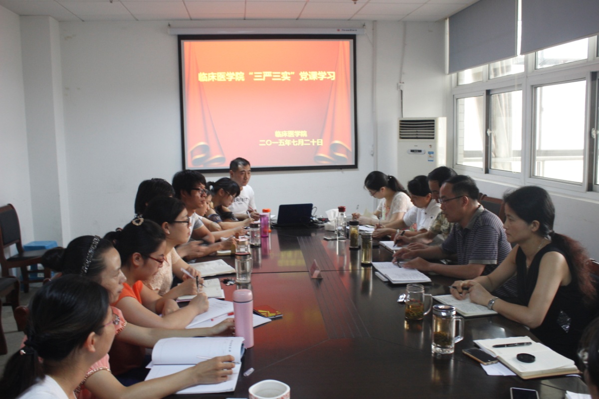 为进一步巩固和拓展党的群众路线教育实践活动成果,持续深入推进党的思想政治建设和作风建设,根据公司党委的部署要求,结合公司党总支的具体安排,2015年7月20日下午,临床医公司党总支开展了“三严三实”专题党课学习,学习会由公司党总支书记戴睿主讲,公司党政领导、党总支委员、各党支部书记、秘书及全体辅导员参加学习。