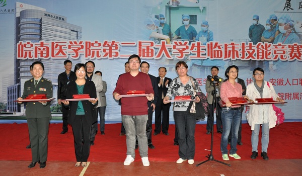 决赛现场 经过一天的激烈角逐,下午四时许,比赛顺利结束。闭幕式上,总裁判长施松主任对本次竞赛进行了全面总结和精彩点评。 池州市人民医院副经理刘少忠宣布比赛成绩。特别奖获得者:池州市人民医院代表队、皖南医学院第一附属医院第一和第二代表队;一等奖获得者:芜湖市第一人民医院代表队、马鞍山市人民医院代表队;二等奖获得者:芜湖市第二人民医院代表队、皖南医学院第二附属医院代表队、中国人民解放军第123医院代表队、马鞍山市中心医院代表队;三等奖获得者:宣城市人民医院代表队、中国人民解放军第105医院代表队等11支代表队。华怡红等16名同学获得单项个人操作奖。