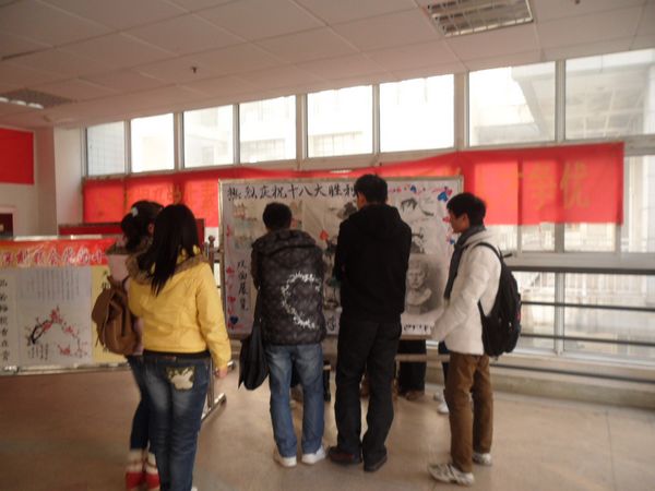 三、书画展览,共赞盛世 12月3日,医学一系2012级团总支宣传部在图书馆西辅楼二楼门厅举办了“庆祝党的十八大”的书画作品展,寄托和表达了同学们对党的深厚感情和对十八大胜利召开的喜悦之情,展示了2012级临床学子的别样风采和积极向上的精神风貌。 本次书画展获得了医学一系2012级同学的大力支持,展出作品数量众多、内容积极、形式多样。其中,书法作品囊括了篆、隶、钢笔字,绘画作品也涵盖了山水、花鸟、素描、漫画等不同种类,更有书画合璧的优秀作品分外夺人眼球。 精美的书画作品吸引了很多同学驻足欣赏,流连忘返。同学们都饶有兴趣地欣赏着展出作品,品味着作品的内涵,相互交流体会,还有同学在展板前与自己喜欢的艺术作品合影留念,将艺术的美好与青春的激情定格在记忆中。
