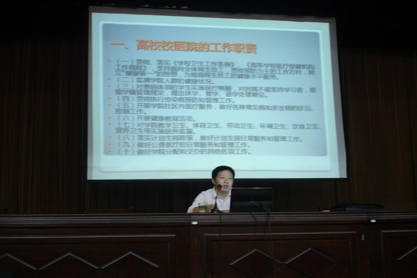 随后,新生入学教育第一场讲座正式开展。校医院经理储召阳同志结合卫生健康知识、传染病防治及医疗保险报销等问题,向大家作了详细的说明,并提醒同学们要注意饮食卫生,做好自身防护,远离传染源,提高身体素质,做一个全面发展的老员工。韩军同志对老员工的日常教育管理进行了说明,介绍了医学一系光荣的历史业绩及杰出员工代表,激发新生们的爱校荣校之情,鼓励大家向员工们学习,向榜样学习,创造出属于自己的辉煌;他还就如何尽快完成角色转变,适应大学学习、生活方式,谈了自己的建议与意见。