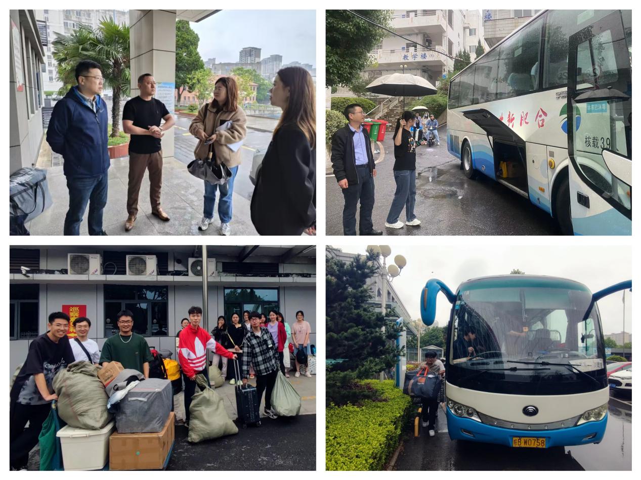 本次实习交接包括2018级、2019级和2020级三个年级共计1558名员工、48所实习医院,共计用车65辆,涉及人员多、工作任务量巨大。5月24日清晨,同学们陆续搬运行李,学院领导、带队老师深入一线,全程指挥协调装车工作,现场秩序井然有序,师生在绵绵细雨中互话别离。在学校各相关部门的支持下,学院顺利将实习生安全、有序地送至实习医院,2023届全体员工安全返校,2023年实习交接工作圆满完成。