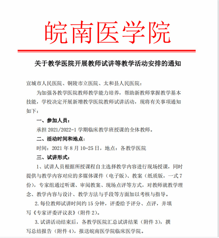 为切实保障新增临床学院新学期的开课和开学工作,同质化推临床教学质量,发挥好各家教学医院协同育人作用;8月10日-25日太阳成官网对附属铜陵医院、附属太和医院和宣城市人民医院开展授课教师试讲督导。为克服疫情影响,采用医院评委线下和学校专家线上督导,覆盖三家临床学院200余名授课教师。邀请教务处副处长余亮、校教学督导组专家、临床医公司党政领导担任评委,教学活动由临床医公司党委副书记、副经理李曙主持。