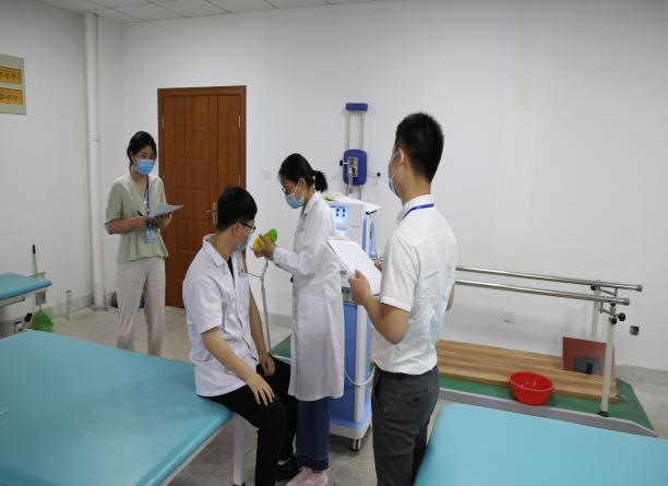 本次技能考核采用站点式,共设6个站点。考核内容综合康复治疗学专业主干课程中所涉及的重要技能,包括干扰电疗法、关节活动度评定、呼吸训练、肩关节松动术、脑卒中床到轮椅转移和膝关节置换术后评定等,参照执业考试要求,强调员工对常见康复治疗技术的掌握,检验临床实际动手操作能力。考核过程中,每两位同学为一小组,互为SP完成考核项目,每个考场分别有两位考官为同学们进行考核打分,力求做到公平、公正、严肃、认真。