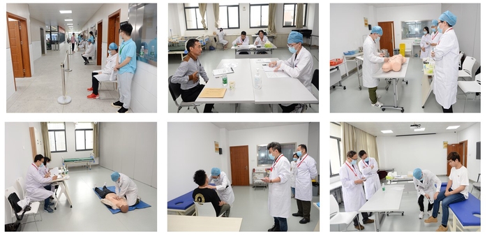 6月20日至21日,临床基本技能考试在临床医学实验实训中心分2组(每组设6个站点)同时进行,有1名总考官、3名站长、30名考官、18名SP病人参加考核工作,涉及考务、辅考、后勤保障等人员50余名。技能考试主要考查员工的病史采集、体格检查和基本操作技能,以及沟通交流能力与人文关怀等。考试过程中,考官严格执考,考生认真操作和作答,工作人员恪守岗位,各工作环节紧密相扣、有条不紊。