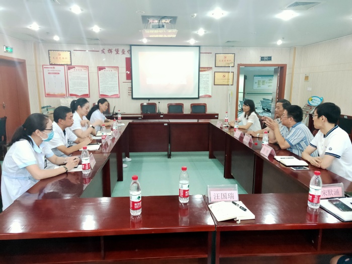 8月26日下午,临床医公司党委书记刘群、副经理李曙、党委副书记陶香香、全科医学教研室主任蒋静涵等一行六人赴镜湖区镜湖新城社区卫生服务中心、弋江区中南街道社区卫生服务中心进行走访调研,镜湖新城社区卫生服务中心党支部书记袁清华、主任王业文、芜湖市眼科医院副经理俞爱华、中南街道社区卫生服务中心主任刘素芹、社区科室主任参加会议。