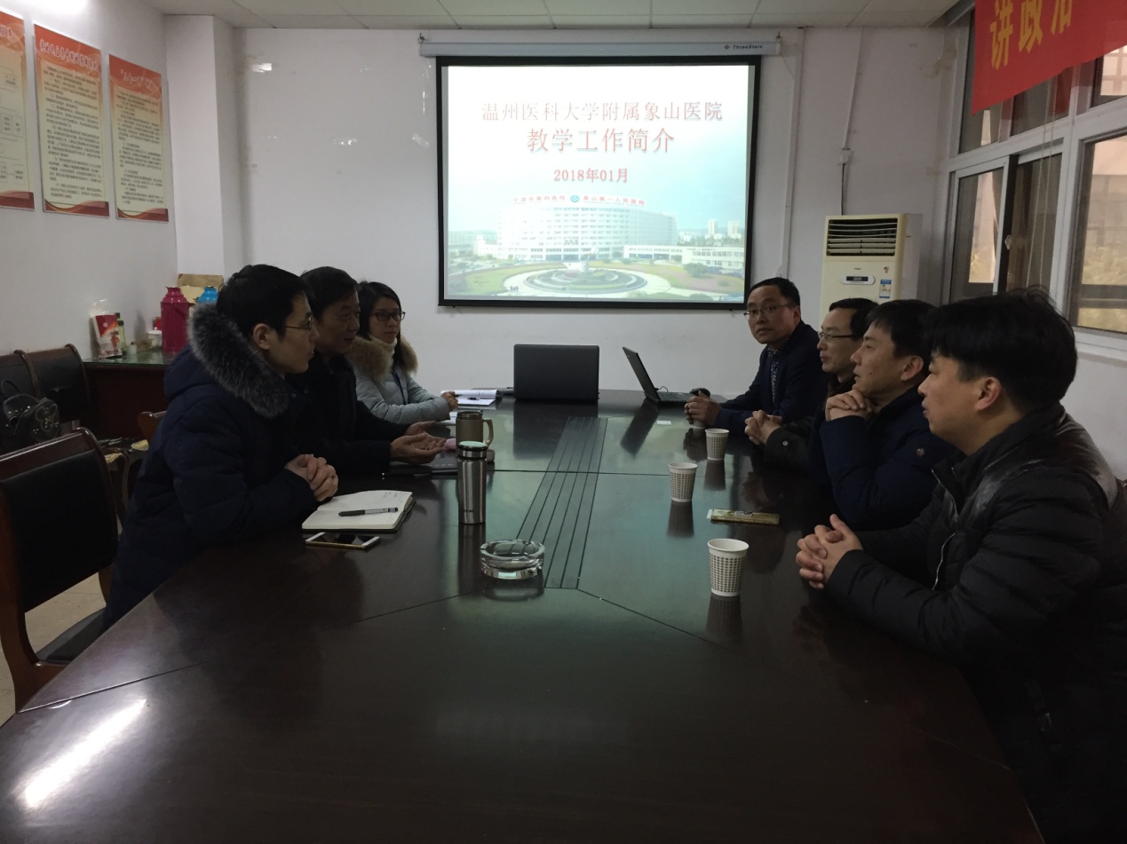 1月7日上午,浙江省宁波市象山县卫计局党委副书记、副局长史美德,象山县第一人民医院副经理谢龙腾,象山县第二人民医院经理孙忠敏以及象山县第二人民医院经理助理邱沿波等一行4人来公司太阳成官网交流工作。临床医公司党委书记刘群、副经理李曙、教学工作秘书、员工工作秘书及2018届毕业班辅导员,在学院会议室热情接待了来宾。