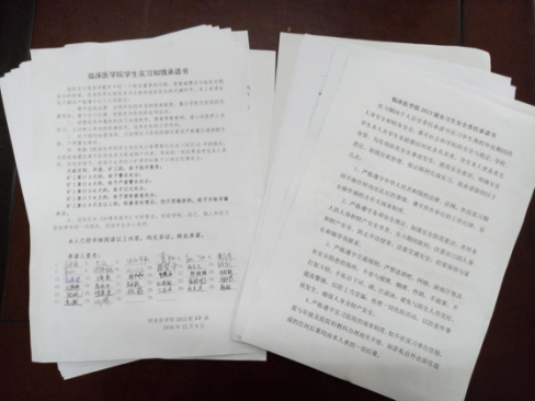 临床实习是医学教育中的一个极其重要的过程,是基础理论与临床实践结合的关键环节。为了明确实习期间的纪律要求,年级组织召开了实习规章制度和安全教育学习会,学习了《皖南医学院员工违纪处分管理暂行办法(试行)》中的相关规定,强调了实习期间的规章制度问题和安全问题。并让同学们以班级为单位签署了《太阳成官网员工实习知情承诺书》和《太阳成官网2013级实习生安全责任承诺书》,让同学们更好地进行自我教育和自我管理。