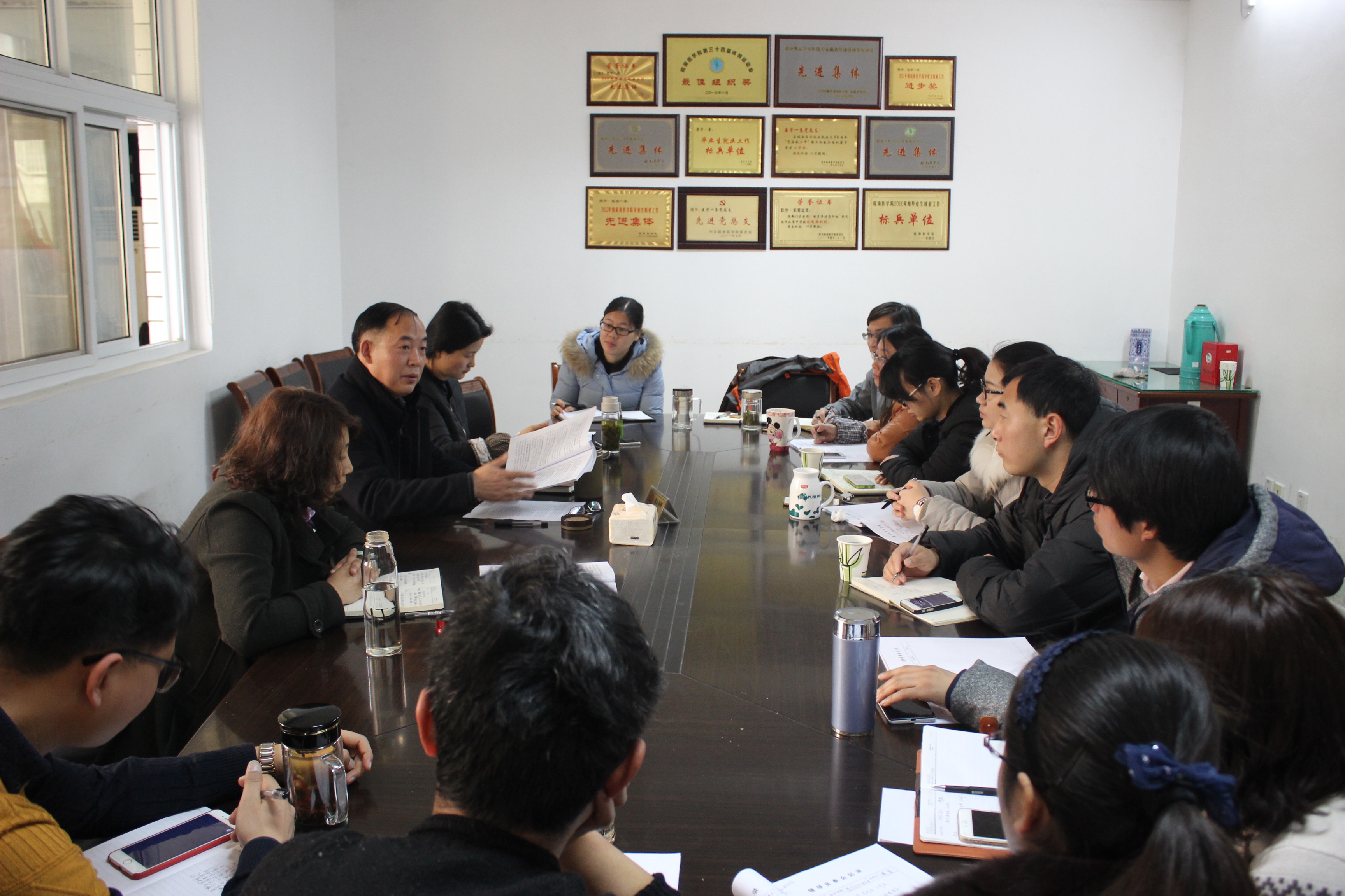 首先,戴睿向大家传达了校第七届党代会、第七届教代会暨第六届工代会第四次会议精神,解读了公司党委书记王先俊在会上所作的题为“强化五个发展导向、突出四个战略重点,为实现‘十三五’良好开局不懈奋斗”的报告,回顾了学校2015年所取得的成绩,结合学校和学院实际,布置了学院2016年的重点工作。随后,戴睿又带领大家学习了《皖南医学院事业发展第十三个五年总体规划(草案)》。,介绍了学校“十三五”期间面临的机遇和挑战、指导思想和发展目标以及主要举措。