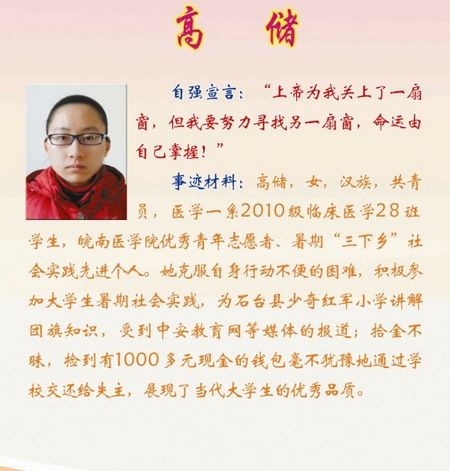 近日,从2011年度寻访“中国老员工自强之星”活动组委会传来喜讯,公司2011年度“自强之星标兵”刘伟、“自强之星”高储两位同学和我省其他高校的26名同学一起荣获“中国老员工自强之星”提名奖,并获得2000元的“中国老员工新东方自强奖学金”。寻访“中国老员工自强之星”活动由团中央和全国学联主办,中国青年报社和中国高校传媒联盟承办。活动旨在从老员工中挖掘可亲、可信、可学的优秀典型,营造老员工自立自强、健康成长的良好氛围,引导青年员工大力弘扬中华民族的传统美德,为建设社会主义和谐社会做出应有的贡献。 公司从2007年开始开展“皖南医学院老员工自强之星”评选活动至今,通过广泛发动、培育挖掘、认真评选、积极申报、广泛宣传和典型引路等有效措施,在全校老员工中引起了强烈反响,发现和树立了一大批以“皖南医学院老员工自强之星”为代表的优秀老员工典型,先后有罗林、沈琦、唐云丽、王京晔、赵国飞、刘伟、高储等7名同学荣获“中国老员工年度人物”和“中国老员工自强之星”提名奖,成为公司共青团组织加强青年老员工思想政治教育的一项重要举措。