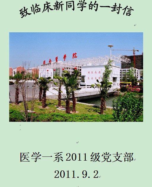 致临床新同学的一封信 亲爱的同学们: 你们好! 首先祝贺大家在经历了努力奋斗和一番拼搏之后,在人生的十字路口,交给了自己一份满意的答卷。走出辗转难眠的黑色六月,步入向往已久的大学殿堂。伴随高考硝烟的远去,如何快速融入老员工活,已成为摆在所有新生面前的一个刻不容缓的话题。为了帮助各位新同学能够更好更快的融入老员工活,我们现在致信一封,请同学们仔细阅读。 一声亲切问候 九月金秋结硕果,十年寒暑尽风华。大多数的同学们都是怀着一份激动,伴着一份好奇,踏入大学校门的。九月的阳光是明媚的,皖医的校园也因为你们的到来而充满了朝气。在这里,医学一系2011级代表皖医、代表医学一系对各位新同学的到来,致以亲切的问侯:“亲爱的同学们,皖医欢迎您,医学一系欢迎您!” 两条奋斗主线 大学是传播并创造知识的地方,是名师汇集的地方。珍惜眼前的学习时光,你会开辟出一片属于自己的领域。大学的课程有很多,基本上可以分为基础课、公共课、专业课和选修课。面对专业方面的课程,要学会自己主动去学习,要变“要我学”为“我要学”,让图书馆、阅览室成为我们的第二课堂。尤其是作为临床专业的同学们,今后将要从事的是治病救人的工作,这就要求同学们必须具备精湛的医术和高尚的医德,所以同学们就更要努力奋斗,争取以优异的成绩走出皖医的校门。 大学的生活是丰富多彩的,你将会拥有很多的空闲时间,如何有效地支配这些时间,树立正确的生活态度,同样是你们所要重视的。建议大家空闲时间里,多多参加实践,拓展自己的生活面,不要将自己的生活局限在一个很小的范围内。你可以结合自己的爱好,挑选一个属于自己的舞台;你可以广交朋友,锻炼自己的交际能力;你可以积极参加各类体育活动,强健体魄。同学们可以做的事情很多,但要记住:要尽量避免与正常的学习相冲突。总之,老员工活是丰富多采的,多去尝试,将自己的生活营造的五光十色。 三位辅导老师 2011级辅导员刘韦、王平和叶长江三位老师将陪伴同学们一起度过五年时光。三位辅导员老师将在你们今后的老员工活中竭尽所能地帮助、指导、培养各位同学,使同学们能够健康、快乐、顺利的成才、成人。欢迎各位同学联系我们! 年级办公室电话 0553-3932428 刘韦老师13855367436 QQ403522996 王平老师13956195130 QQ1508003502 叶长江老师13855380090 QQ451673062 四个“正确对待” 正确对待同学。对于刚刚进入大学的你们来说,在未来的四年里,如何和来自五湖四海的同学相处是一个很重要的问题。由于成长于不同环境,刚开始的交往难免会有些困难,这个时候就需要主动交往,相互适应,相互尊重,相互关心。同学之间相处难免会产生小摩擦,要学会理解与宽容。发生了冲突,要记住:退一步,海阔天空;让三分,心平气和。在日常的生活中,要团结同学,一切以集体的利益为先。五年的老员工活,将是你人生中最美好的一段时光,建立起来的同学情谊,将是人生最珍贵的情谊。 正确对待爱情。“如果在老员工活中能找到自己人生伴侣,将是一个非常浪漫幸福的事情”,有很多老员工都认为大学中的爱情是纯洁的、神圣的,大学是谈恋爱的最佳时光。但还是要提醒一下,大学跟恋爱没有必然的联系。缘来了,我们珍惜;缘未至,不可强求。为了恋爱而恋爱,只能是伤人伤己。要是耽误了自己的学业就更是得不偿失了。所以希望同学们能正确的态度对待爱情。 正确对待网络。我们不强调 “不要上网”之类的口号,但要求同学们明白自己的身份,知道自己的首要任务是什么。有的同学可能大学之前没上过网,到了大学之后开始对网络产生一种神秘感,便开始频繁出入网吧等地。不管是真的为了学习还是猎奇,我们都得说一句:网吧是毒药,网络游戏猛于虎。由于沉溺于网络而荒废了学业的例子也屡见不鲜,因此同学们一定要把持住自己,把网络控制在限度之内。同时,掌握一定的计算机操作技能也是必须的。(皖南医学院http://218.22.81.117/index.htm)(医学一系http://218.22.81.117/yxyx/)(员工处网站http://218.22.81.117/xsc/)(教务处网站http://218.22.81.117/jwc/) 正确对待宗教。公民都有宗教信仰自由,它是公民的基本权利之一。我们不反对、也不支持同学们的宗教信仰。但是,我们提倡同学们要积极向党组织靠拢,要以一个党员的要求来严格的要求自己,递交入党申请书,争取早日入党。还要强调一下:我们严格禁止同学们参加法轮功等邪教组织与集会活动,一经查处,严格处理。 五项“注意防范” 注意防火:不乱丢烟头,不躺在床上吸烟。不乱接乱拉电线。禁止使用电饭煲、电水壶等大功率电器。安全从身边做起,防止悲剧的发生,对自己和他人的生命负责。 注意防盗:注意防范各种有形财产、无形财产被他人恶意的拿、偷、扒、抢、盗,尤其要在宿舍要放好自己的笔记本电脑、钱包等。关键还是要防患于未燃,提高防盗意识。 注意防骗:开学之际,大量人口出入校园,鱼龙混杂,外校人员乘机入校行骗。由于新生对环境不了解,经验不足,往往成为投机分子的下手对象。为防上当受骗,特举几种骗术: (1)新生往往想在大学锻炼自己,骗子往往利用这种想法,以招收学校代理的名义,向你批发大量劣质文具等。 (2)以超低的价格向你推销劣质鞋,化妆品以及其它生活用品。 (3)冒用学校领导或者师兄师姐的名义骗取员工们的信任,