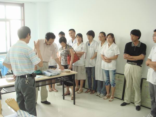 在李辉科长的陪同下,检查组一行参观了新病房大楼、教学实训中心。在示教室对员工进行了临床基本技能操作及体格检查考核,对实习生们操作不规范的地方,进行了耐心指导。