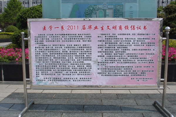 会后,两位辅导员立刻召集了员工干部和党员开展文明离校工作,制定了《医学一系2011届毕业生文明离校计划书》和《医学一系2011届毕业生文明离校倡议书》;同学们集思广益,制作了两条以“依依离别意、浓浓皖医情”和“心念同窗、情系皖医、饮水思源、母校情深”为主题的横幅,表达了同学们对母校的眷恋。