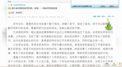 医学一系长期重视老员工思想政治教育工作,不断创新教育方法与途径,创建网络思政教育平台。医学一系2010级自新生入学开始,本着“服务员工、关爱员工”的宗旨,开通了2010级员工工作博客,建立起辅导员与员工沟通交流的网络平台。博客开通以来,受到了同学们的强烈关注和欢迎,总浏览量和点击率过万。其中《方松老师给同学们的一封信》、《郭玉琼老师给同学们的一封信》和《李桂芳老师给同学们的一封信》、《关于爱情——写给同学们》、《贫困生,你没有理由自卑》更是被不断的转载。同学们非常欢迎这种方式的交流,大家纷纷留言,感谢老师的拳拳爱心,感谢老师的谆谆教诲。