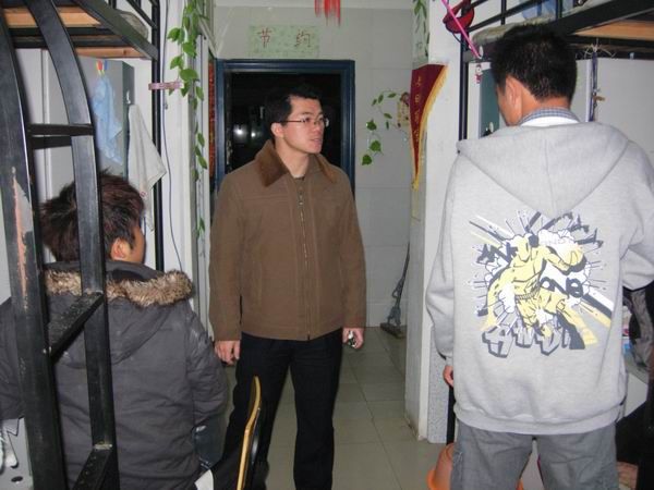 12月20日晚19点,医学一系党总支副书记韩军、系秘书吴金庭与08级辅导员韩波、韩琪、束玉洁、09级万磊、伍长娟一同深入员工宿舍,关心、慰问员工期末期间日常安全、生活及学习等情况。老师们走进7号、5号员工公寓,仔细询问了同学们的生活、学习情况,叮嘱大家期末考试将至,要认真备考,诚信考试,以优异的成绩向老师、父母汇报;在生活中遇到困难与问题要及时向老师反映,及时沟通;同时要注意寝室卫生、安全,履行“寝室安全承诺书”的约定,营造一个安全、卫生、文明的宿舍环境。