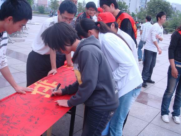 同学们在文明就餐的横幅上签名