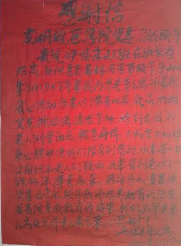 活动结束后,老人与志愿者们依依不舍,与大家留影纪念。“为华”老年公寓负责人还专门写了感谢信,感谢志愿者们对老人们的关爱。
