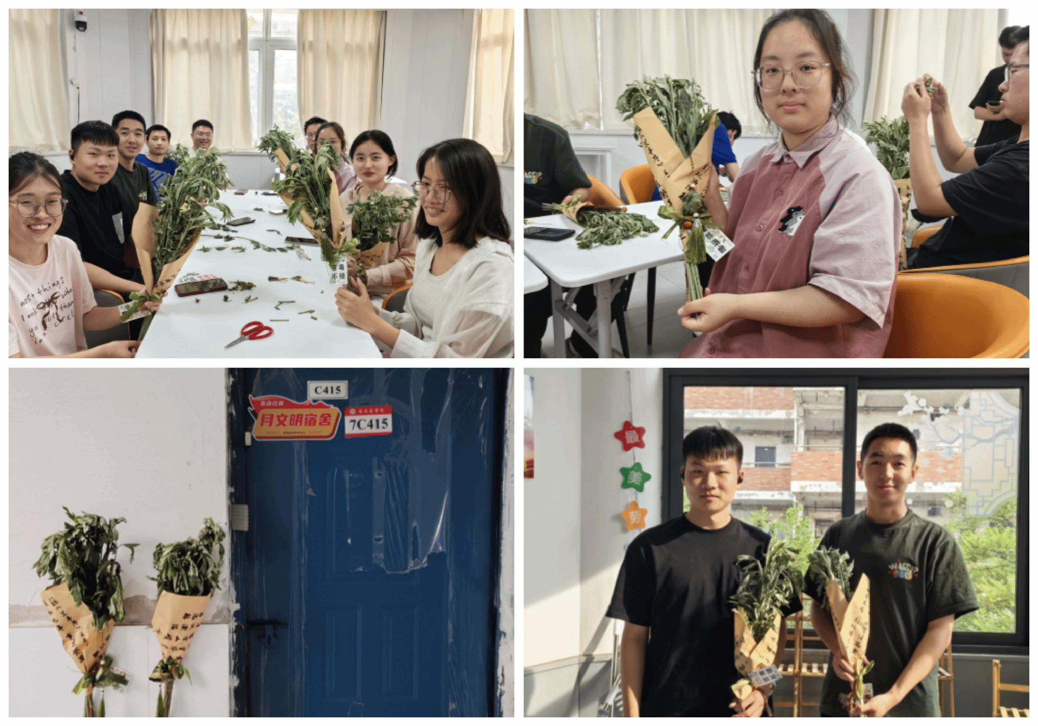 “清明插柳,端午插艾。” 艾草在端午节有特殊的寓意,承载着古人对健康、平安的美好期许。5月30日,社区开展端午艾草花束DIY制作活动。活动中,同学们纷纷动手,精心挑选艾草枝叶,巧妙搭配色彩,用心缠绕丝带,再点缀上小巧的香囊、五彩的葫芦等装饰。在制作过程中,大家互相交流、互相帮助。同学们表示:“自己做的艾草花束比买的更有意义,不仅保留了传统意义,还能装点生活。”制作完成后,同学们将这些艾草花束装点在寝室门前,赠予师长、同学,这不仅延续了驱虫避瘟的传统寓意,更彰显着医员工 “悬壶济世” 的职业担当。