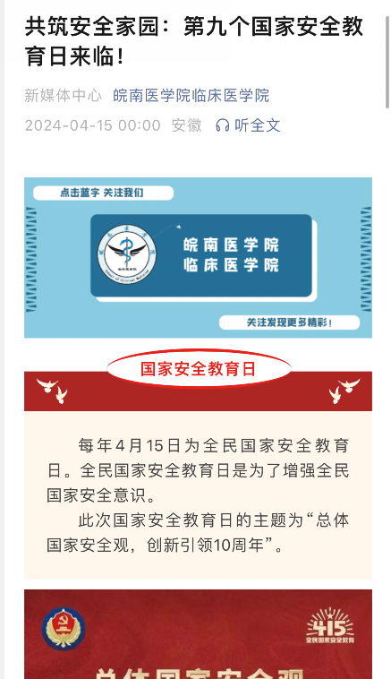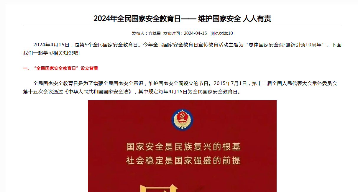 广泛宣传。公司充分利用微信公众号、网站宣传专栏、展板等形式,有针对性地开展国家安全普法宣传,营造浓厚的宣传教育氛围,加强师生对总体国家安全观的深入了解,让“国家安全”意识入脑入心。