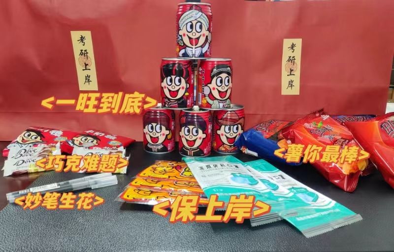 随后,老师们为考研学子送上了暖心的“考研上岸”大礼包,礼包承载学院着对考研学子的美好祝福,包括“妙笔生花”、“一旺到底”、“巧克难题”、“薯你最棒”、“保上岸”五件套,寓意威“五”霸气,一举夺“葵”。热情的问候、贴心的礼包,让同学们备受鼓舞,大家纷纷表示一定会拿出最好状态冲刺备考,奋力拼搏、成功上岸。
