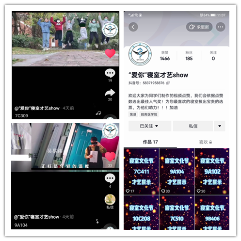 共建文明宿舍,共创和谐未来。本次寝室文化节活动分为“宿舍风采大赛”和“寝室文化才艺展示大赛”两个阶段。“宿舍风采大赛”重在宿舍环境设计和卫生的维护,要求所有宿舍打造温馨卫生的“温馨小家”。“寝室文化才艺展示大赛”要求以寝室为背景,精心拍摄、制作短视频,并发布在抖音平台“爱你临床寝室风采show”中。寝室文化节活动的成功举办,有利于促进员工身心健康发展,在潜移默化中增进各寝室成员间的感情和凝聚力。发布在抖音平台的才艺展示视频在员工中反响热烈,不少员工家长在视频下点赞、留言,也弥补了家长们因疫情原因无法进入学校参观孩子宿舍的遗憾,拉近了家庭与学校的距离。