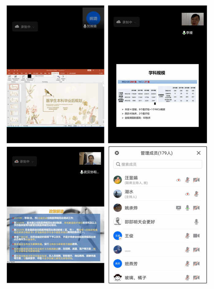 毛玲教授从住院医师规范化培训的发展历程、聘用条件和待遇政策等方面,对目前国家及省规培制度与相关政策进行了解读;李嫚教授以华中科技大学同济医学院附属协和医院神经内科科室为例,介绍了规培生培养方案与培养规划;在政策解读的基础上,姚承烨教授对医员工本科毕业后的职业规划进行了分析和建议。会后,员工针对个人就业和进一步发展中存在的疑惑和三位专家进行了线上的答疑和交流。