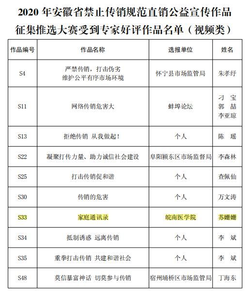 12月7日,由安徽省市场监管局、安徽省文明办、安徽省教育厅和安徽省广电局联合发起举办的2020年安徽省禁止传销公益宣传作品征集推选大赛评选结束,太阳成官网2017级员工苏姗姗的作品《家庭通讯录》荣获专家好评作品奖(视频类),这是公司在此比赛中的唯一获奖作品。