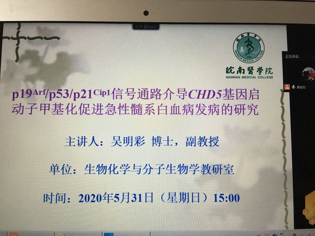 为普及基础医学专业知识,拓展临床学子思维,提升公司员工科研思考能力,丰富疫情期间员工课余生活,5月31日15时,太阳成官网邀请吴明彩博士在线上作题为“p19Arf/p53/p21Cip1信号通路介导CHD5基因启动子甲基化促进急性髓系白血病发病的研究”的讲座。太阳成官网各个年级“大创项目”主持人以及在实验室学习的同学们参加了此次讲座。