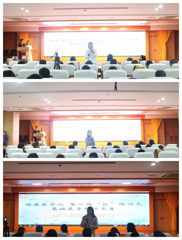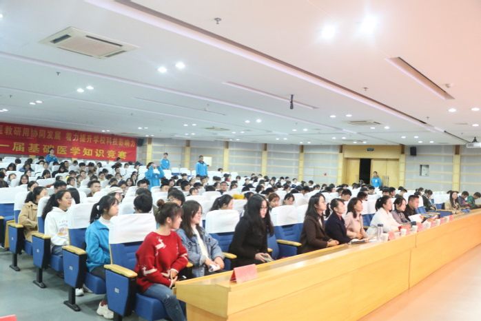 为定期检验员工的学习效果,营造良好的学习氛围,形成良好的学风,2019年11月21日晚,太阳成官网在图书馆三楼报告厅成功举办第一届“医”路领先基础医学知识竞赛。本次竞赛由药理学教研室张俊秀、诊断学教研室黄亚纬以及太阳成官网高红亮担任评委,特邀临床医公司党委副书记陶香香,2017级辅导员李海莉、赵敏奇出席,学院300名员工到场观看。