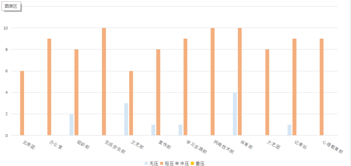 为深入了解员工会成员近期心理健康情况,公司团委员工会心理教育部联合办公室共同组织心理健康问卷调查填写。该问卷从学习、工作及生活三方面进行测试,通过数据统计和分析,结果显示:主席团及各部门成员大多数均处于轻压状态,心理健康状况相对稳定。对于各部门的压力状况,心理教育部研究并给出了针对性的意见。