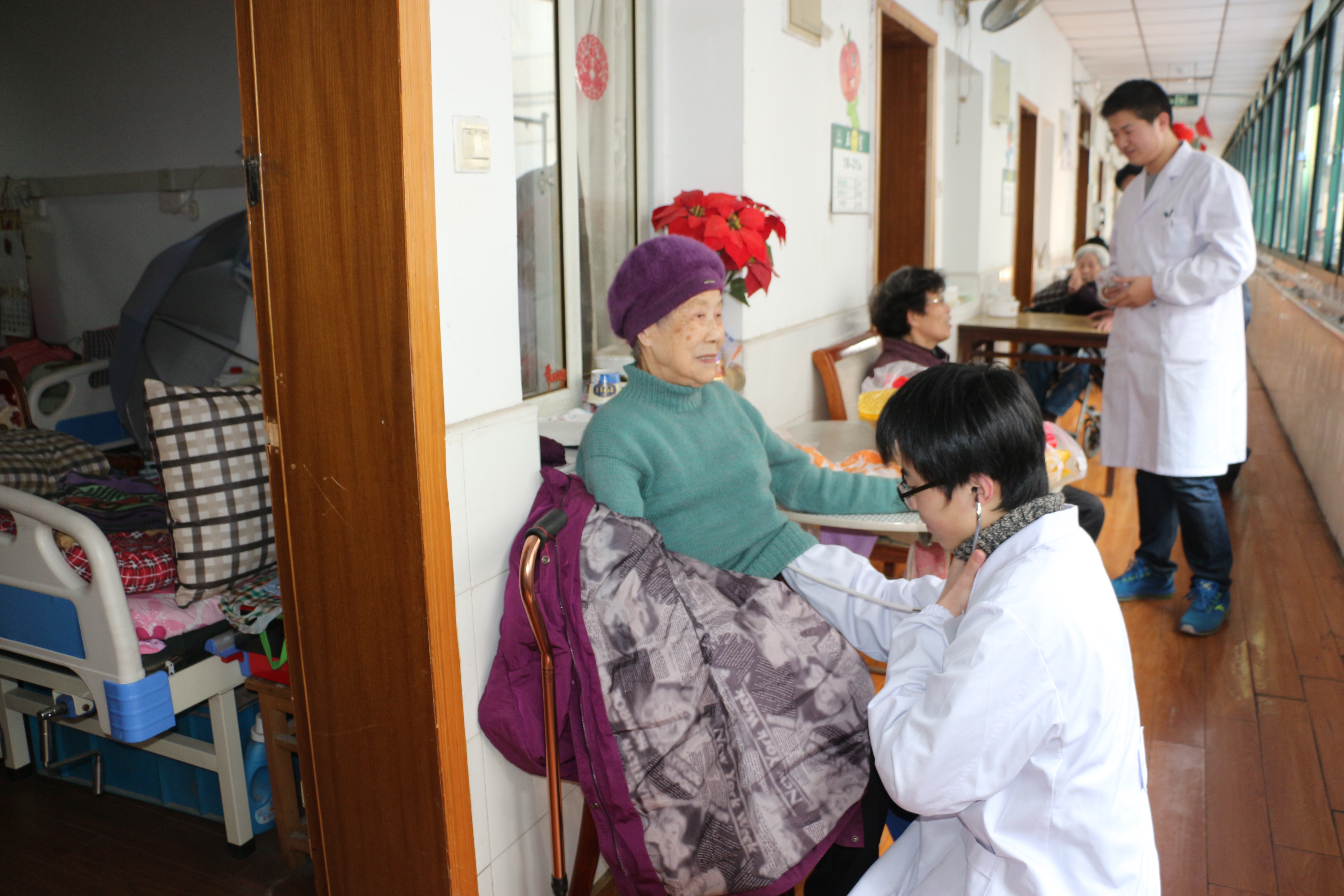 “老人家,最近身体怎么样?降压药在坚持吃没有?”3月1日下午,太阳成官网、影像与检验学院的9位实习同学与南京医科大学的同学们来到梅园街道老年公寓开展志愿服务活动。他们一边给老人们进行常规检查比如量血压,听心音等,一边讲解老年人健康保健的知识,对有慢性病比如糖尿病的老人,更是关切地叮嘱平时饮食、生活中需要注意的事项。除此以外,同学们还为老人们带来了慰问品,陪他们拉家常,帮忙打扫卫生。李奶奶激动地握着同学的手说:“感谢你们来看望我们,还给我们带来慰问品,你们只要来了我们就很开心!”临走前,老人们都依依不舍,王奶奶发自肺腑地唱起了《共产党好》送别同学。