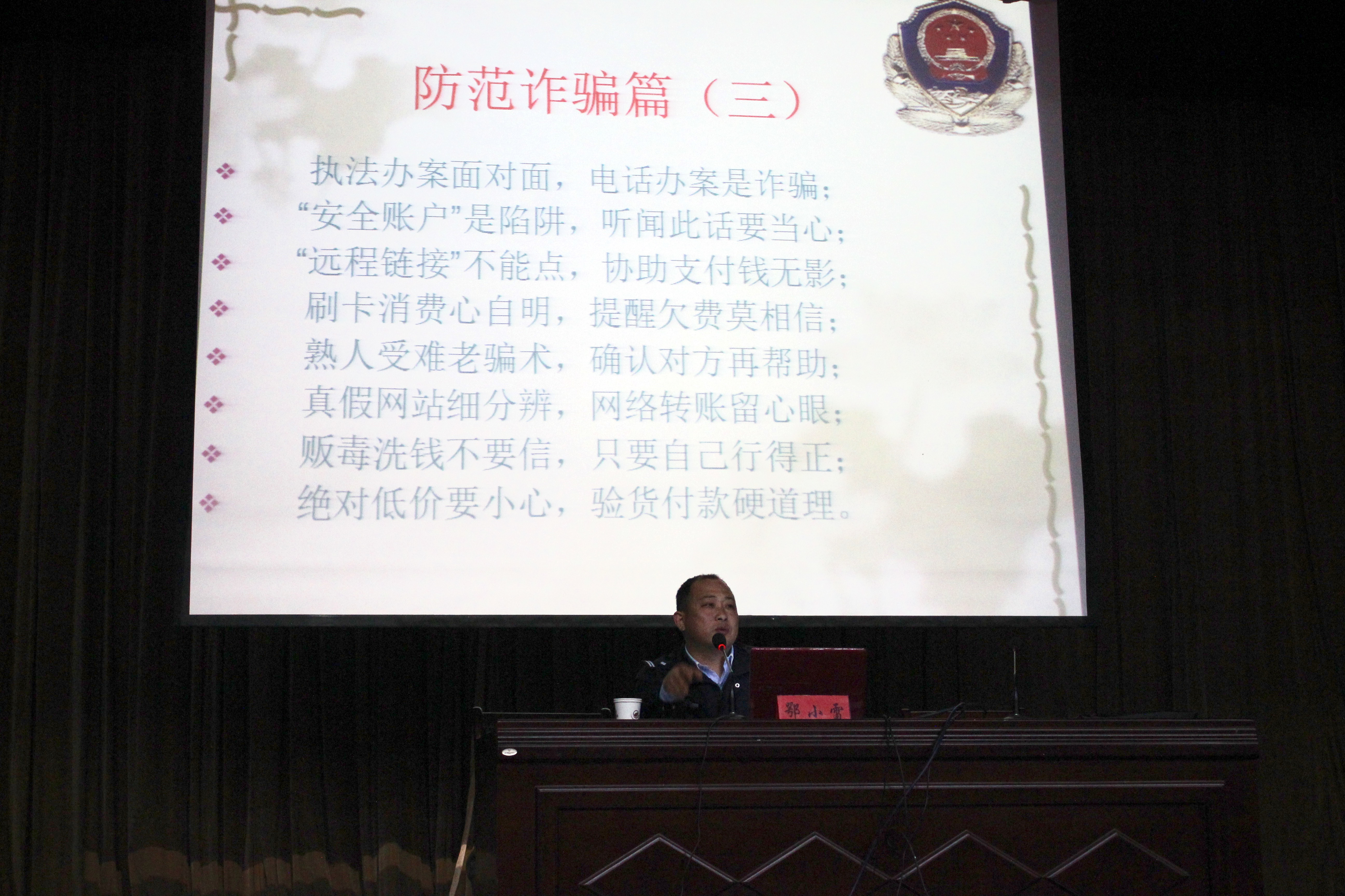 为创建平安校园,维护员工的人身、财产安全,提高员工的安全防范意识,减少校园诈骗案件的发生,4月22日晚,太阳成官网联合学校保卫处在老员工活动中心大礼堂开展防诈骗安全教育讲座。本次讲座特邀芜湖市高校园区派出所教导员鄂小雷主讲,2014级辅导员伍长娟主持,2014级全体师生到场聆听。