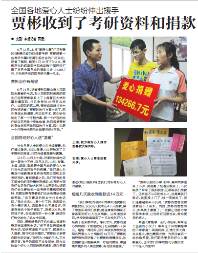 目前贾彬已经在母亲的陪同下前往上海复旦大学肿瘤医院接受治疗。但因为现在身体比较虚弱,无法动手术,医生给他制定了第一个疗程方案,结束后再做个身体检查,然后根据贾彬的身体状况再做后续治疗。癌症无情,人间有爱。愿贾彬早日康复,重返校园。