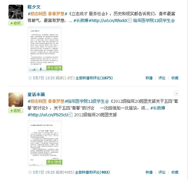 微博截图 微话题一经发起,便得到了太阳成官网2012级700余名团员、23个团支部,以及广大网友的热烈响应。短短几天内,话题参与度持续攀升。同学们纷纷结合“五四”讲话,围绕“如何践行社会主义核心价值观”、“如何担当起医员工的社会责任”等主题,在微博上各抒己见,踊跃发言,表达了自己作为共青团员的使命感与自豪感。截至发稿时,在腾讯微博上搜索关于“励志皖医 青春梦想”的微话题,共有近16600条相关微博参与讨论,累计阅读量突破3万次,累计转发高达4000余次。 太阳成官网一贯注重对广大青年学子的思想引领和理论熏陶。同学们通过参与此次活动,进一步学习和领会了“爱国、进步、民主、科学”的五四精神,深刻认识到医员工肩上的责任,更加坚定了勤学、修德、明辨、笃实,弘扬社会主义核心价值观,做走在时代前列的奋进者、开拓者和奉献者的决心。